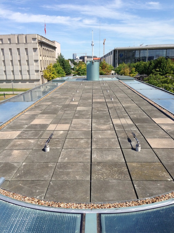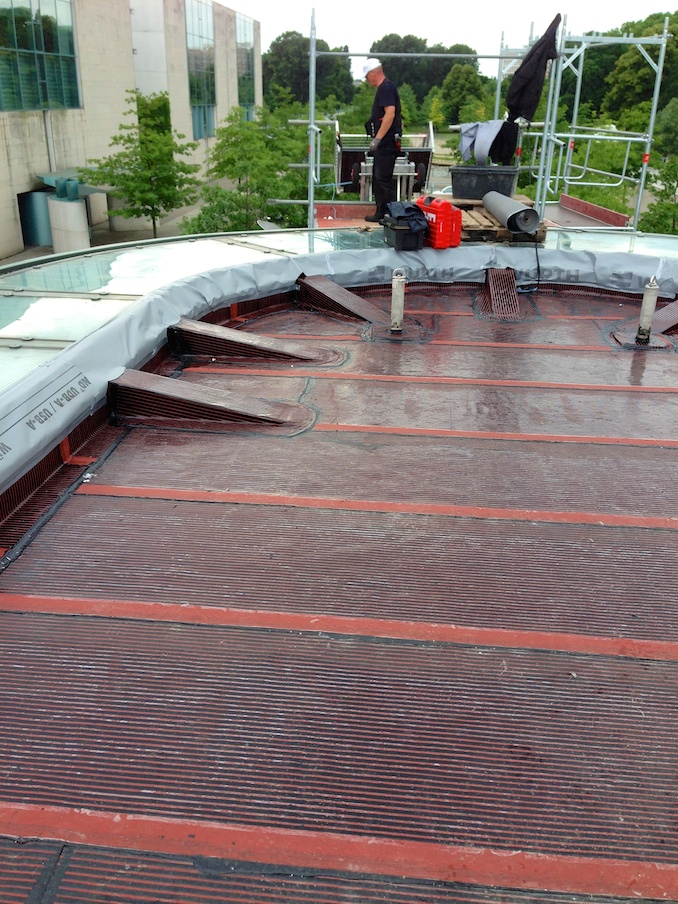 BundeskanzleramtKomplettabbruch der alten Abdichtung einschl. Sicherung der vorh. Betonplatten mit Sondermaß als Oberflächenschutz, neuen Warmdachaufbau mit PU-Wärmedämmung und dreilagiger Abdichtung der Fa. Icopal. Abdichtung von dreieckigen Überzügen, 44 Stck Stahlstützen sowie einem umlaufenden Fensterbandanschluss einschl. Anarbeitung von 48 Stck Stahlflanschen und einer eingelegten Kastenrinne mit Flüssigkunststoff.