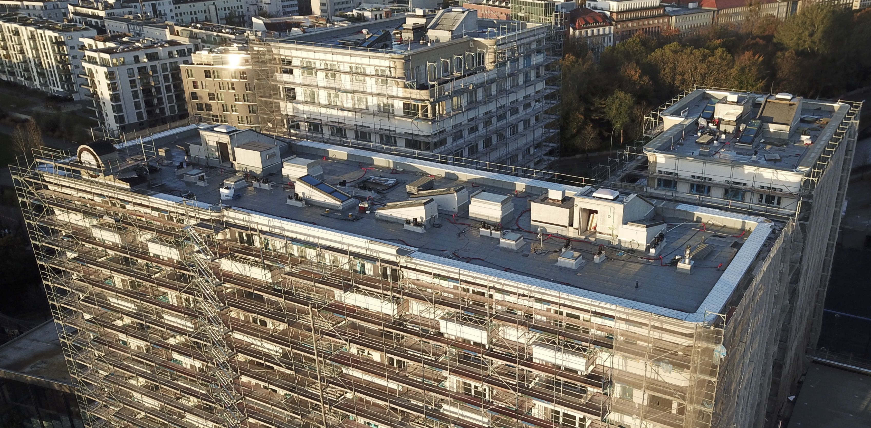 High Park Potsdamer PlatzCa. 3.400 m² Flachdachsanierung einschließlich Flachdachtrocknung, ca. 800 m² Neuerstellung Flachdach, Erstellung der vorbewitterten Titanzinkabdeckungen von ca. 530 m Loggiabrüstungen, teilweise gerundet. Fertigstellung ca. Januar 2018.